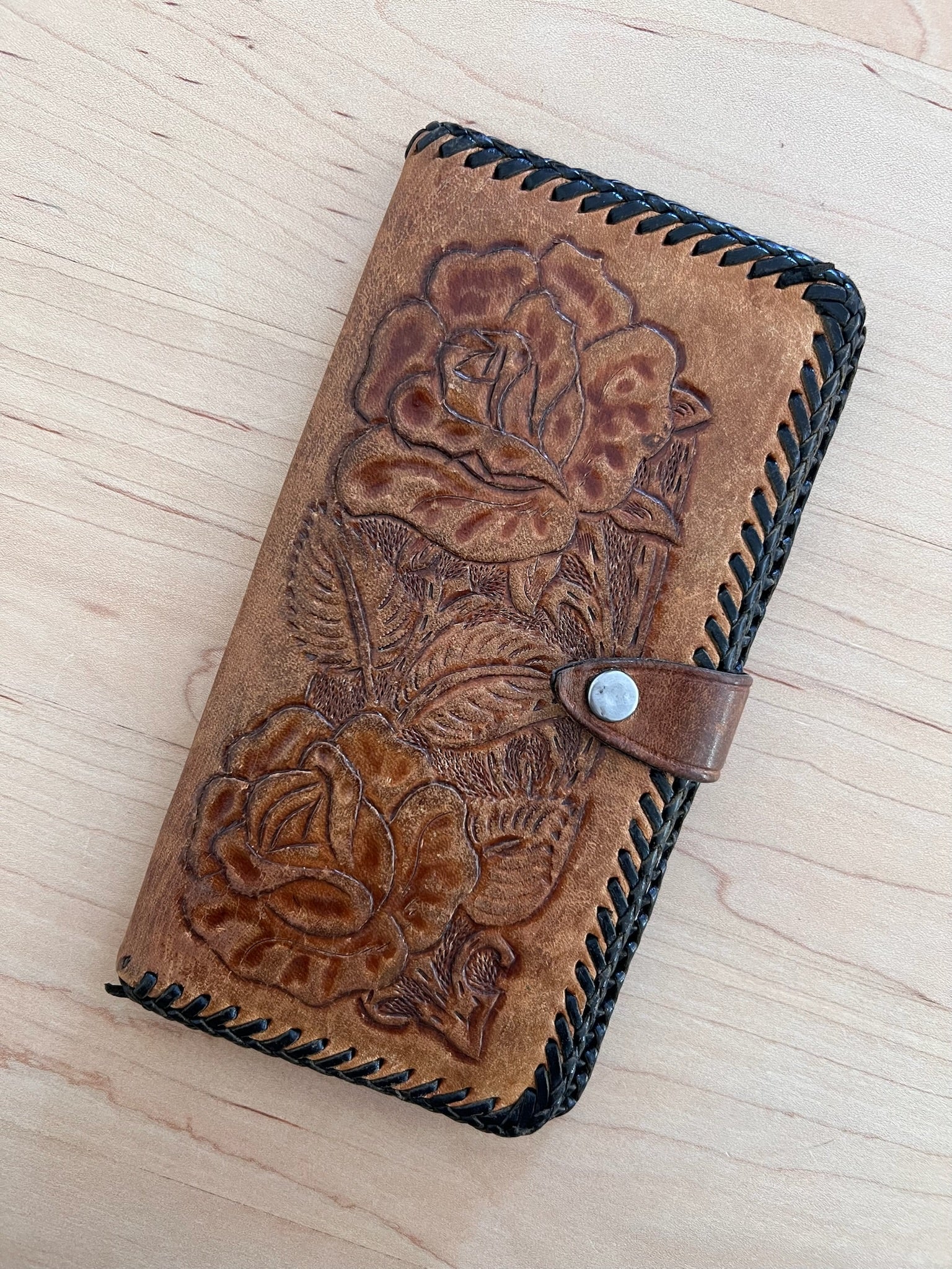 Vintage leather tooled wallet with plenty of compartments. Metal zipper functions for holding change. Snap closure and leather lace trim.