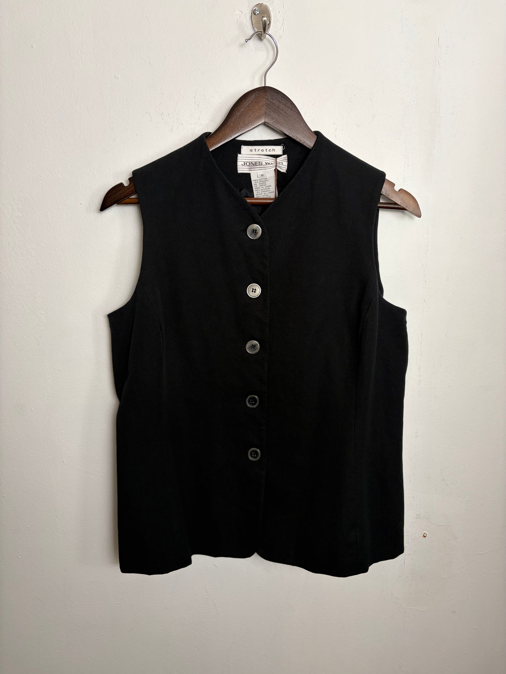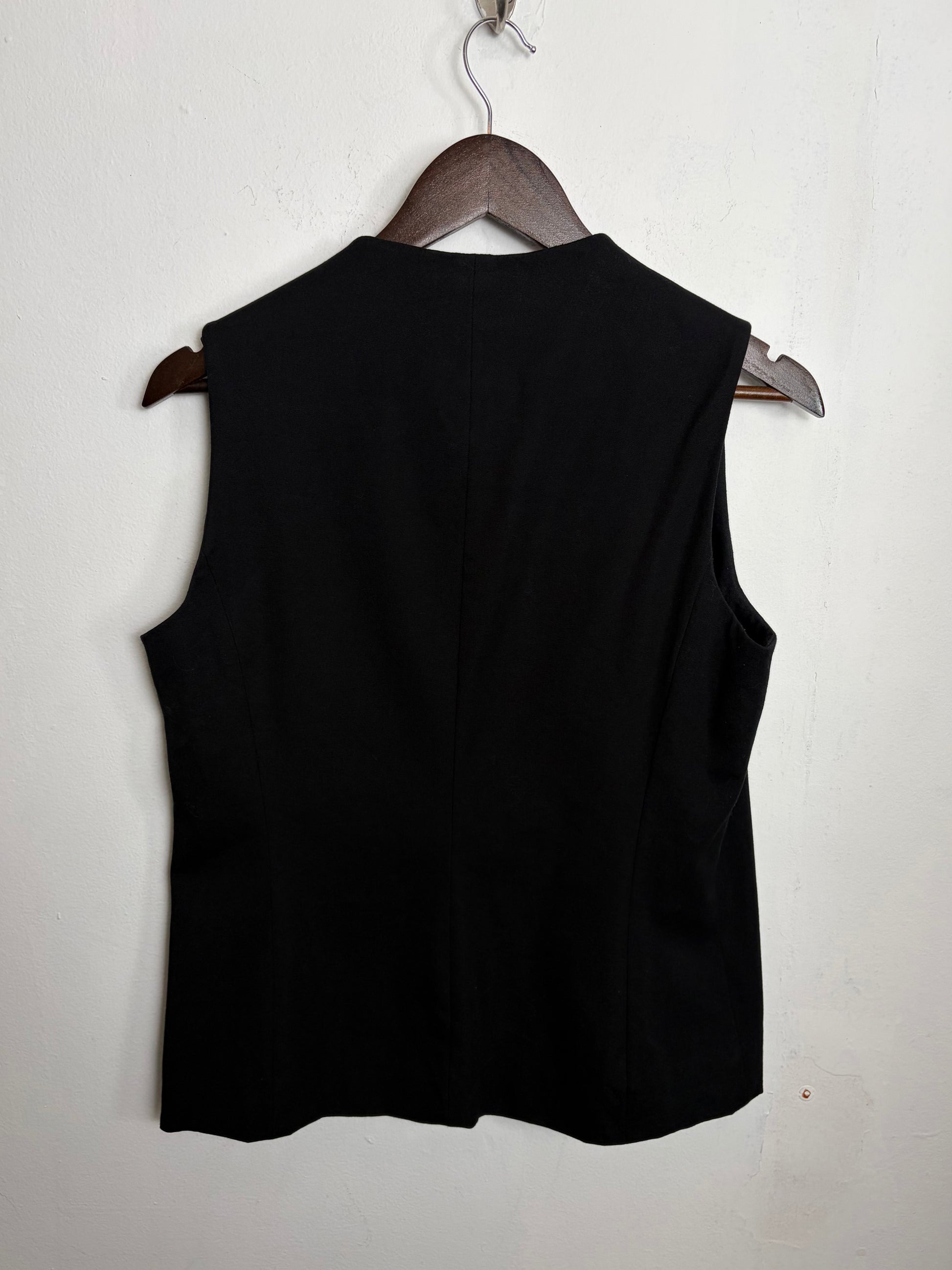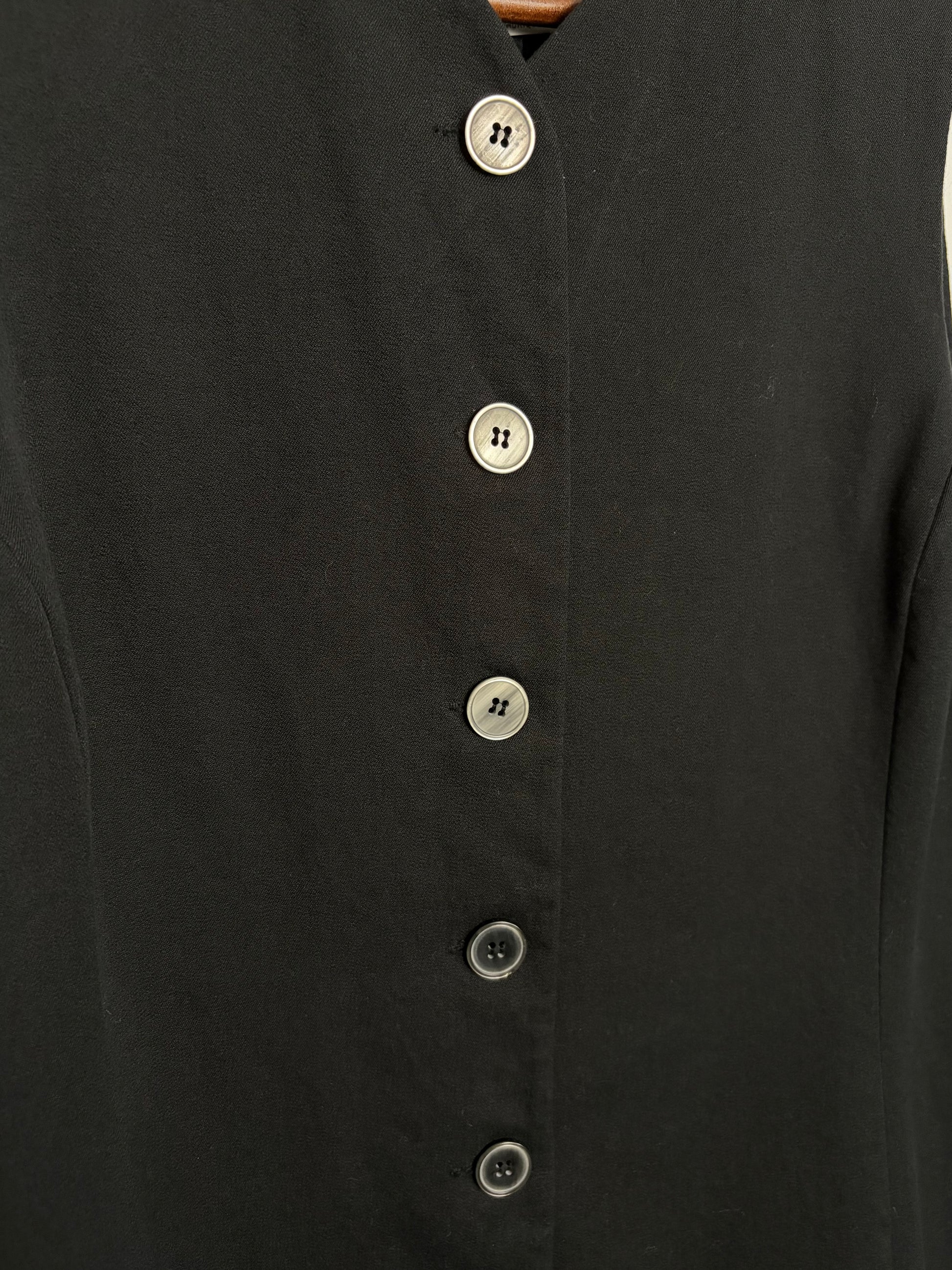 Vintage sleek black tailored vest with a clean, structured silhouette and five-button front. Features a smooth full lining and a minimalist collarless neckline for a modern, polished look. Slightly tapered through the body for a flattering shape- perfect worn on its own, over a tee, or styled under a blazer.