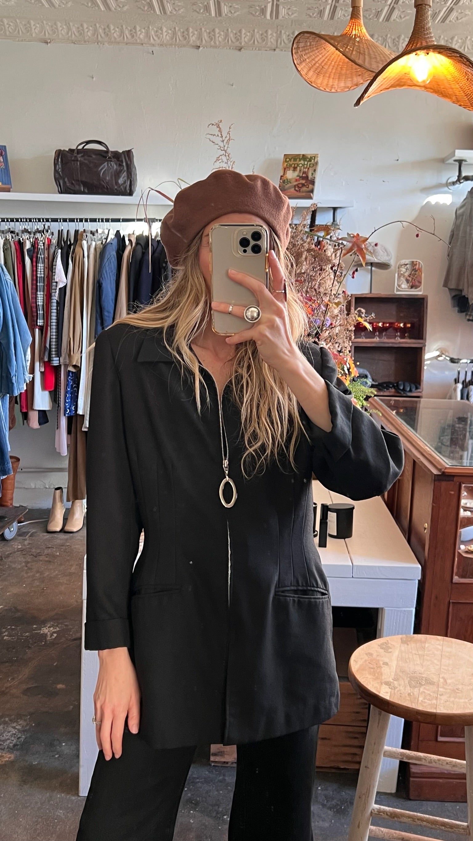 Sleek vintage blazer with a clean zip-front closure and an oversized oval zipper pull for a subtle statement. Features front welt pockets, tapered pre-rolled sleeves, and stitched front pleats that give it a tailored, elongated shape. A sharp, minimal piece that works perfectly as a jacket or a polished top layer.