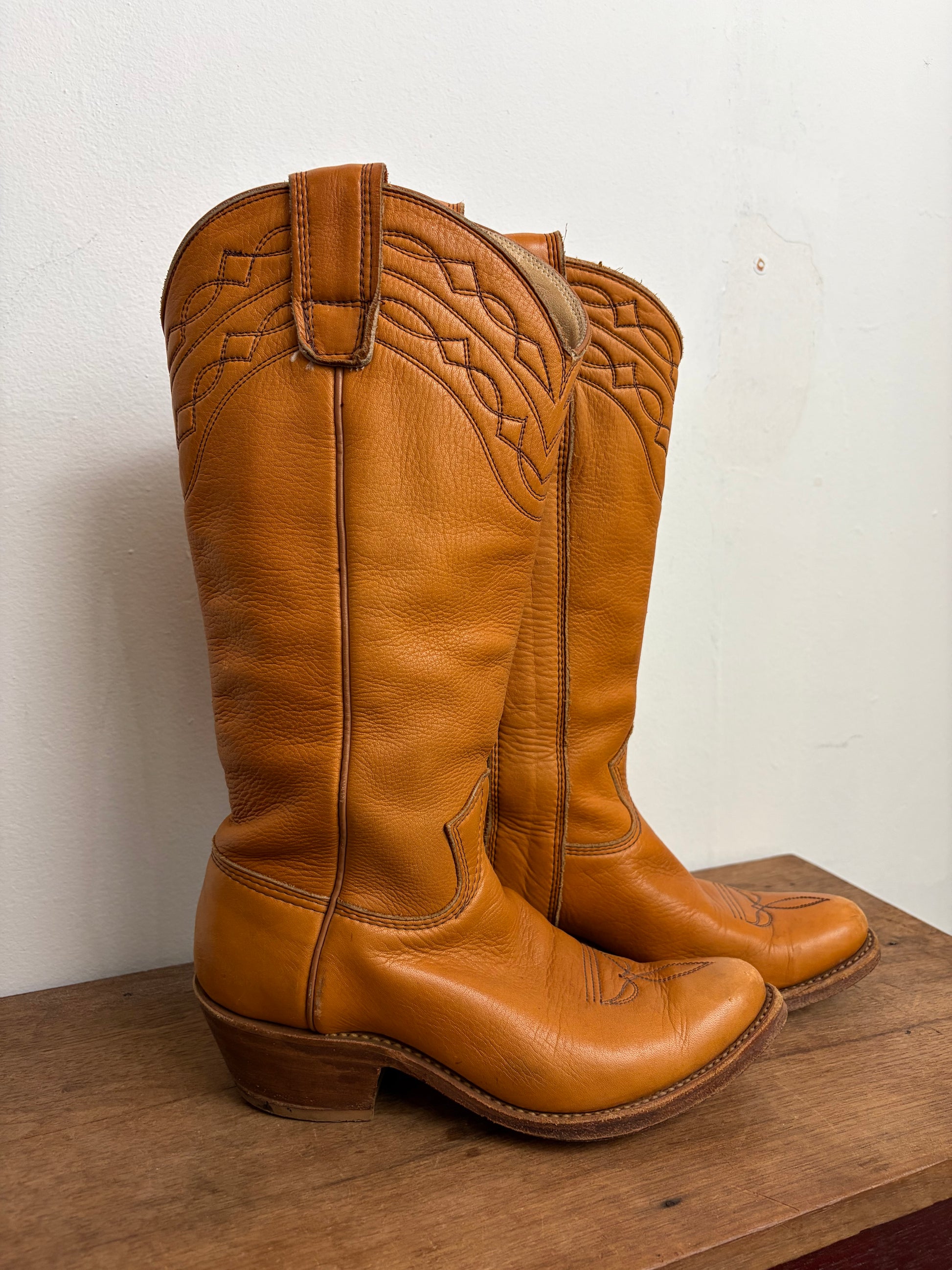 These vintage cowboy boots are made from smooth leather with classic Western stitching along the shaft and toe. They feature pull tabs, a rounded toe, and a stacked heel for a traditional, easy-to-wear fit. A sturdy, well-made pair with timeless Western styling.