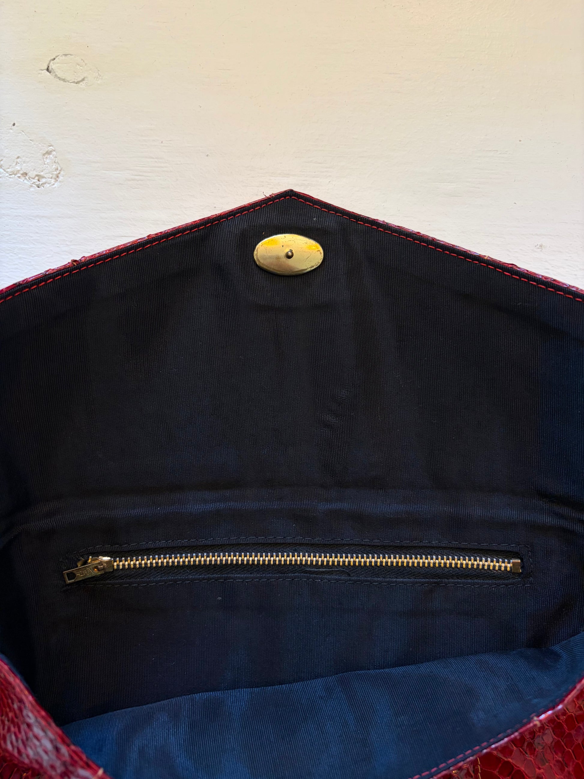 A striking cherry red croc-embossed envelope clutch with a slim, ultra-flat silhouette- perfect for carrying just the essentials. Features a fold-over front with a hidden snap closure that keeps everything clean and minimal. Bold texture, rich color, and an easy under-the-arm shape make it such a good statement piece for day or night.