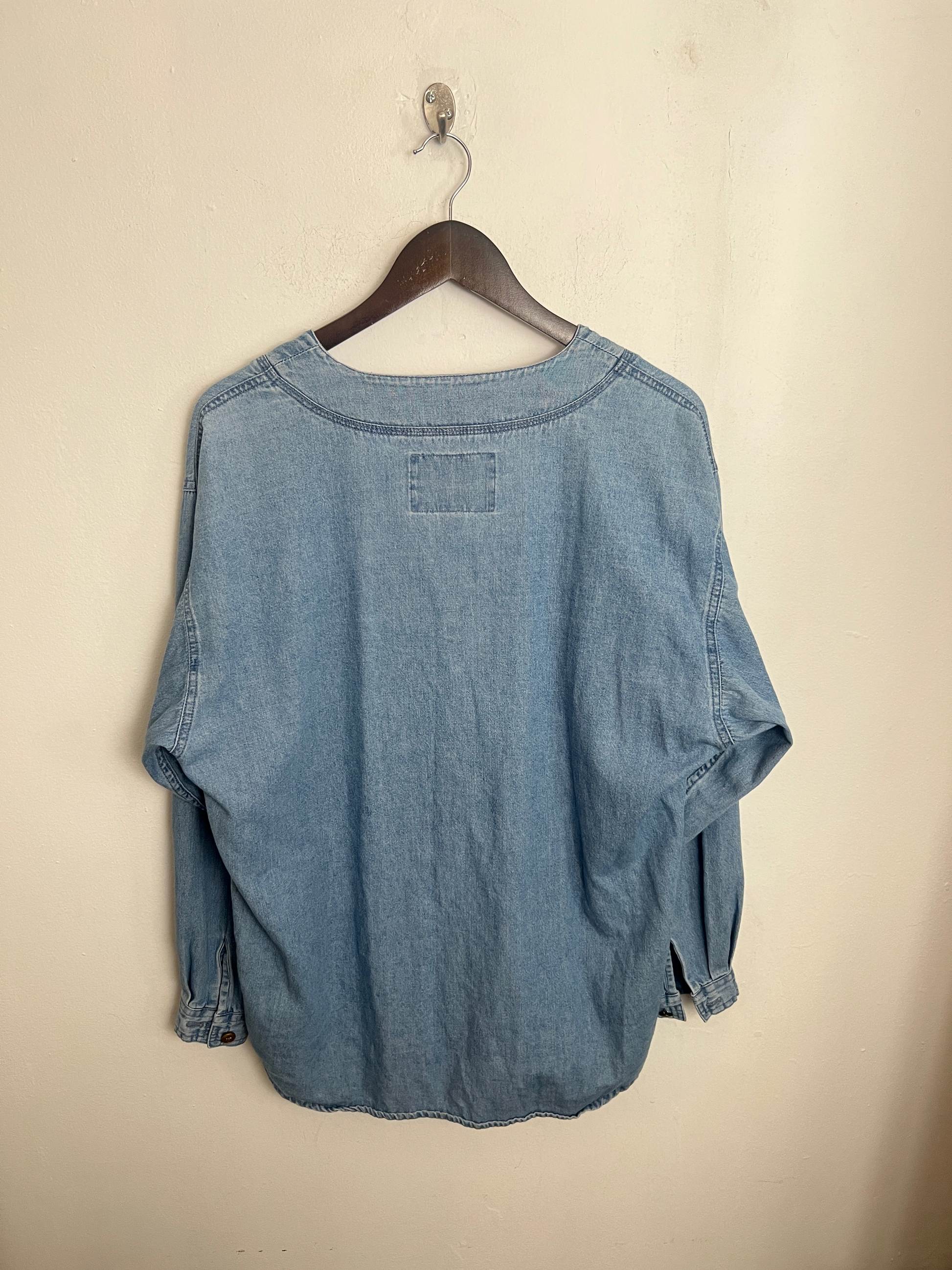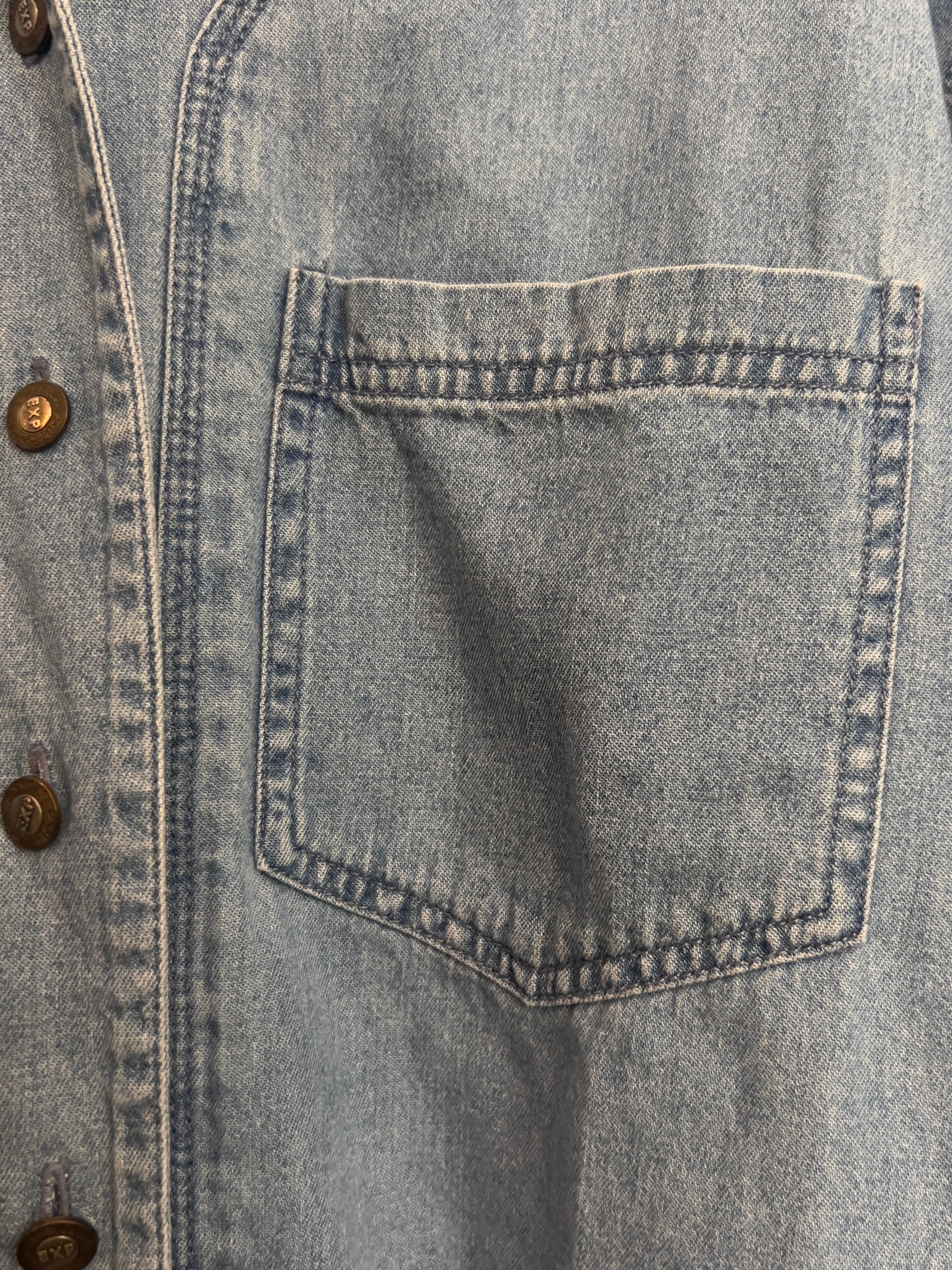 Lightweight denim long-sleeve top features a five-button front closure, a front chest pocket, and buttoned cuffs at the wrists. Its relaxed silhouette and retro-casual design make it a versatile piece, perfect for pairing with your favorite bottoms for effortless everyday style.