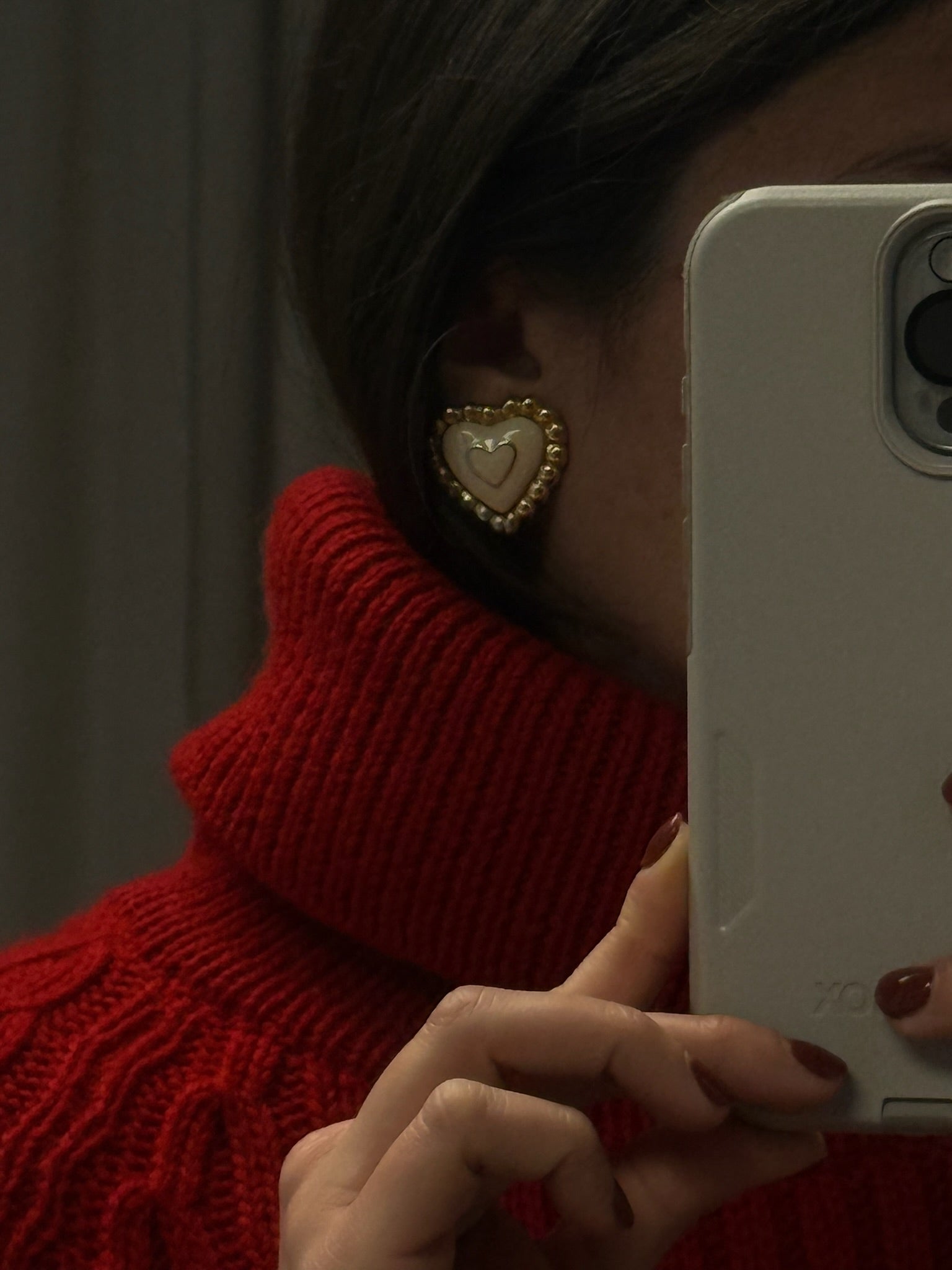 Dainty vintage clip-on earrings with an intertwined bead-like faux gold boarder. Sculpted with a cream colored heart center for casual wear or an accent to your Valentine’s Day look.