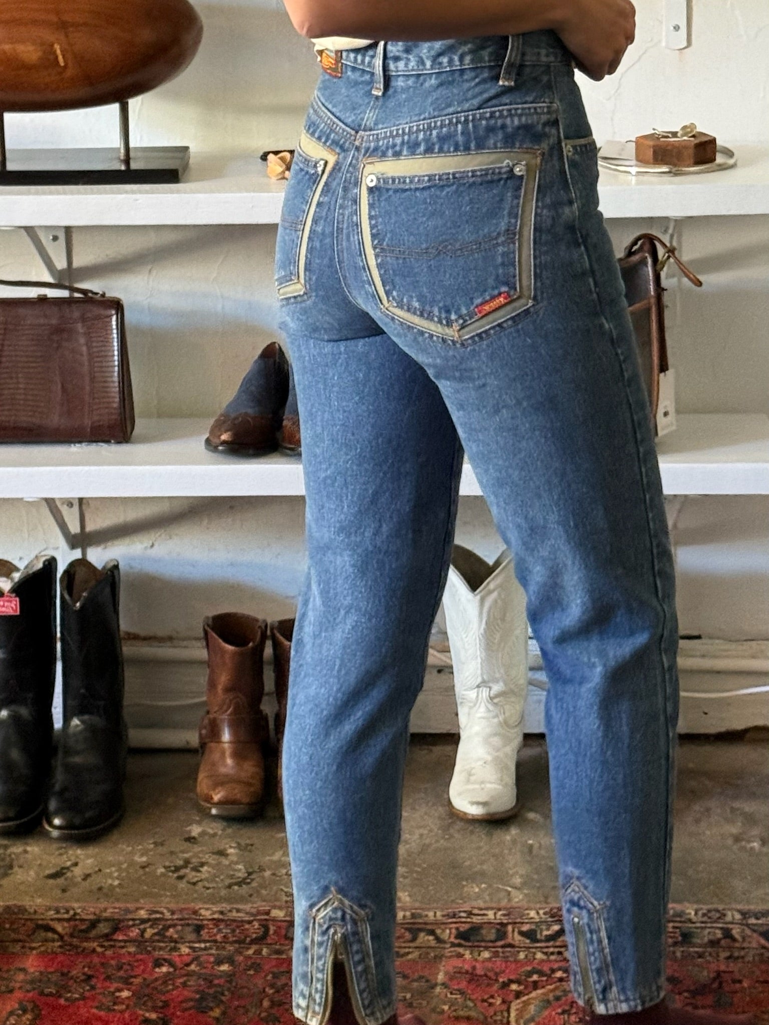 These vintage Jordache jeans feature a high-rise fit with a slightly tapered, skinny leg that flatters the shape while keeping a classic 80's edge. Made from sturdy mid-wash denim with contrast piping, zippered ankles, and a woven Jordache logo patch at the back waistband - they're the perfect mix of timeless and bold.