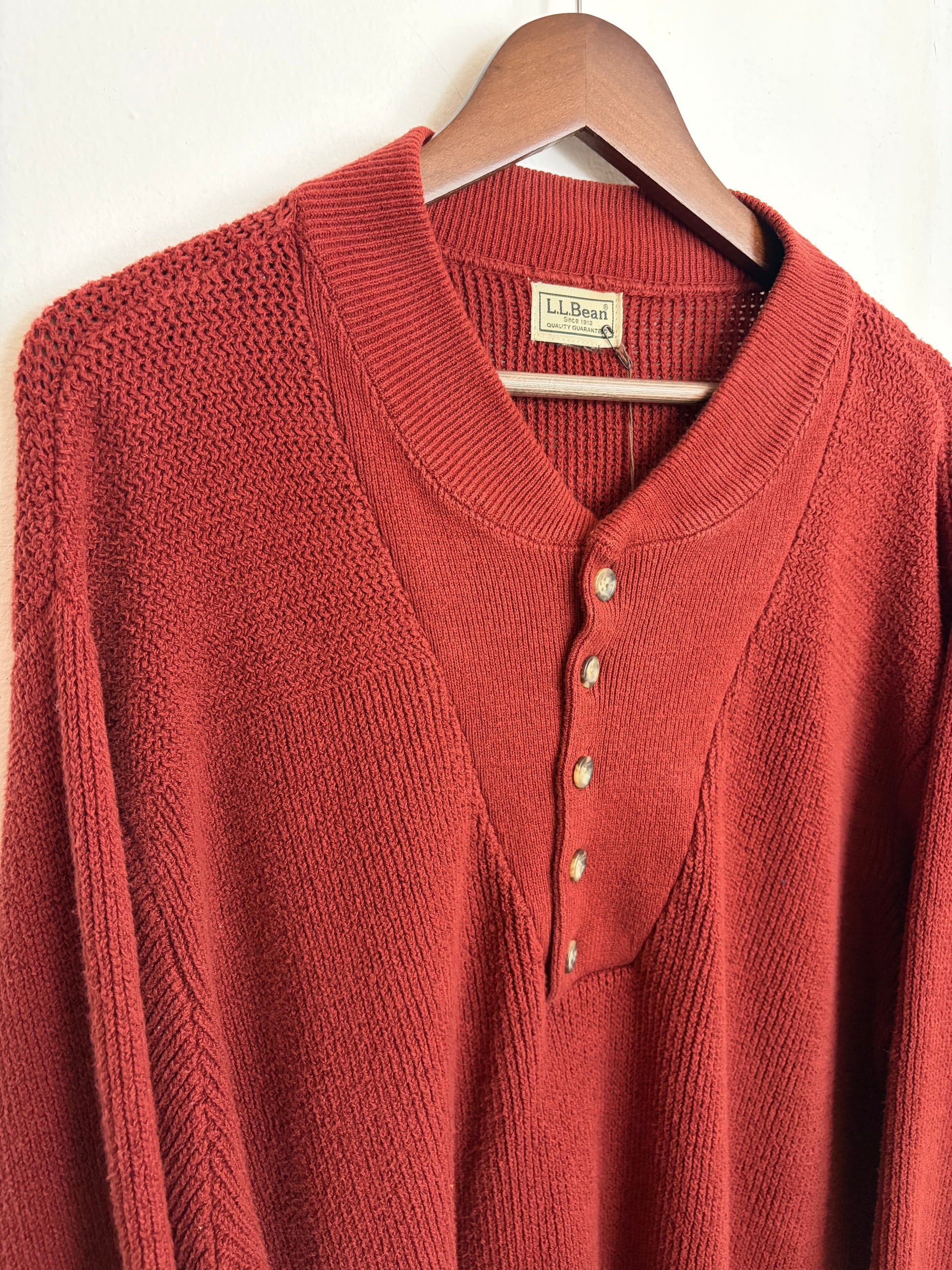 Vintage L.L. Bean knit henley in a warm brick red tone. Features a heavyweight knit with textured paneling, ribbed trim, and a five button front. Relaxed fit with a straight hem and thick collar. Sturdy, well made, and easy for everyday wear.
