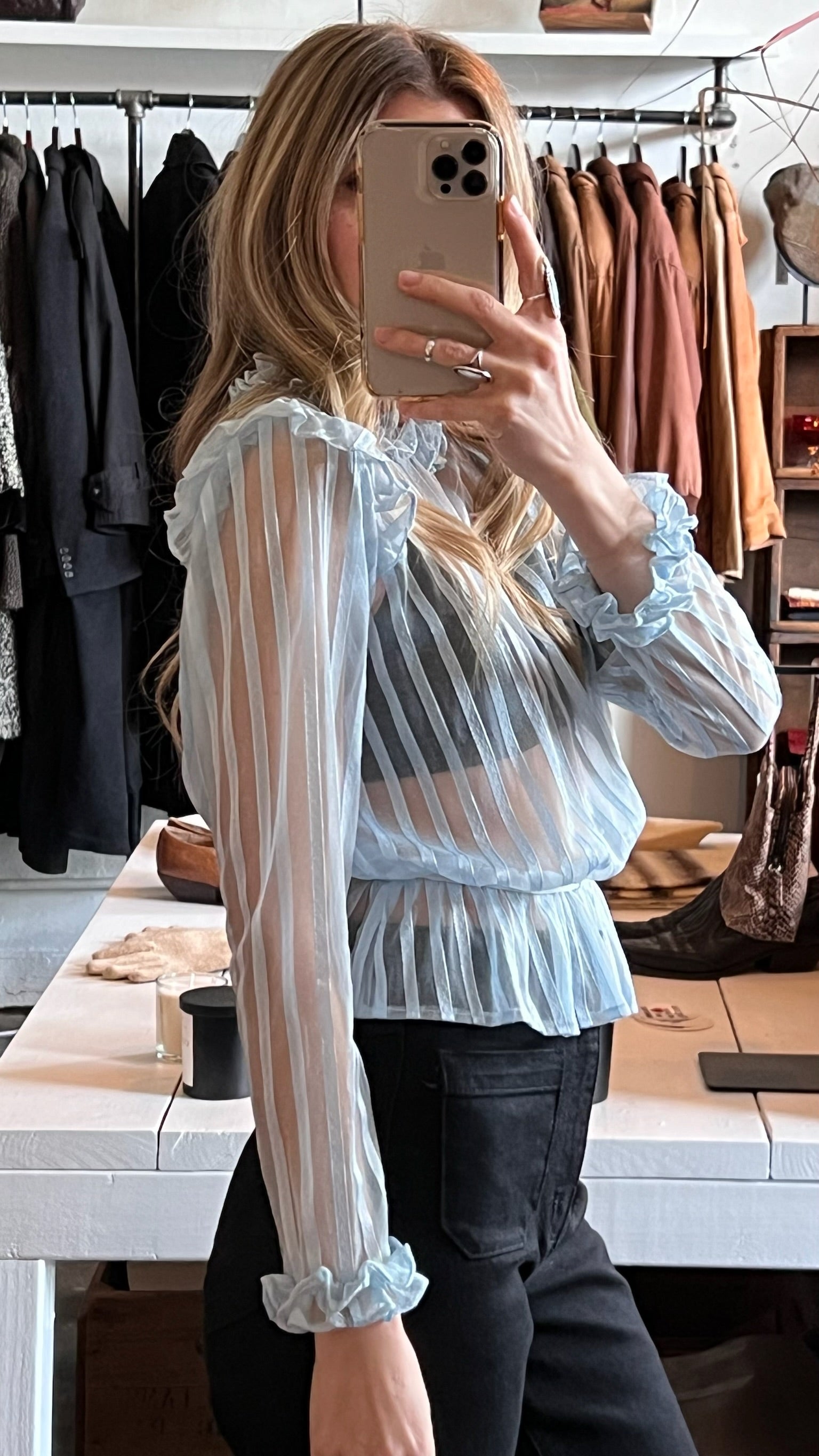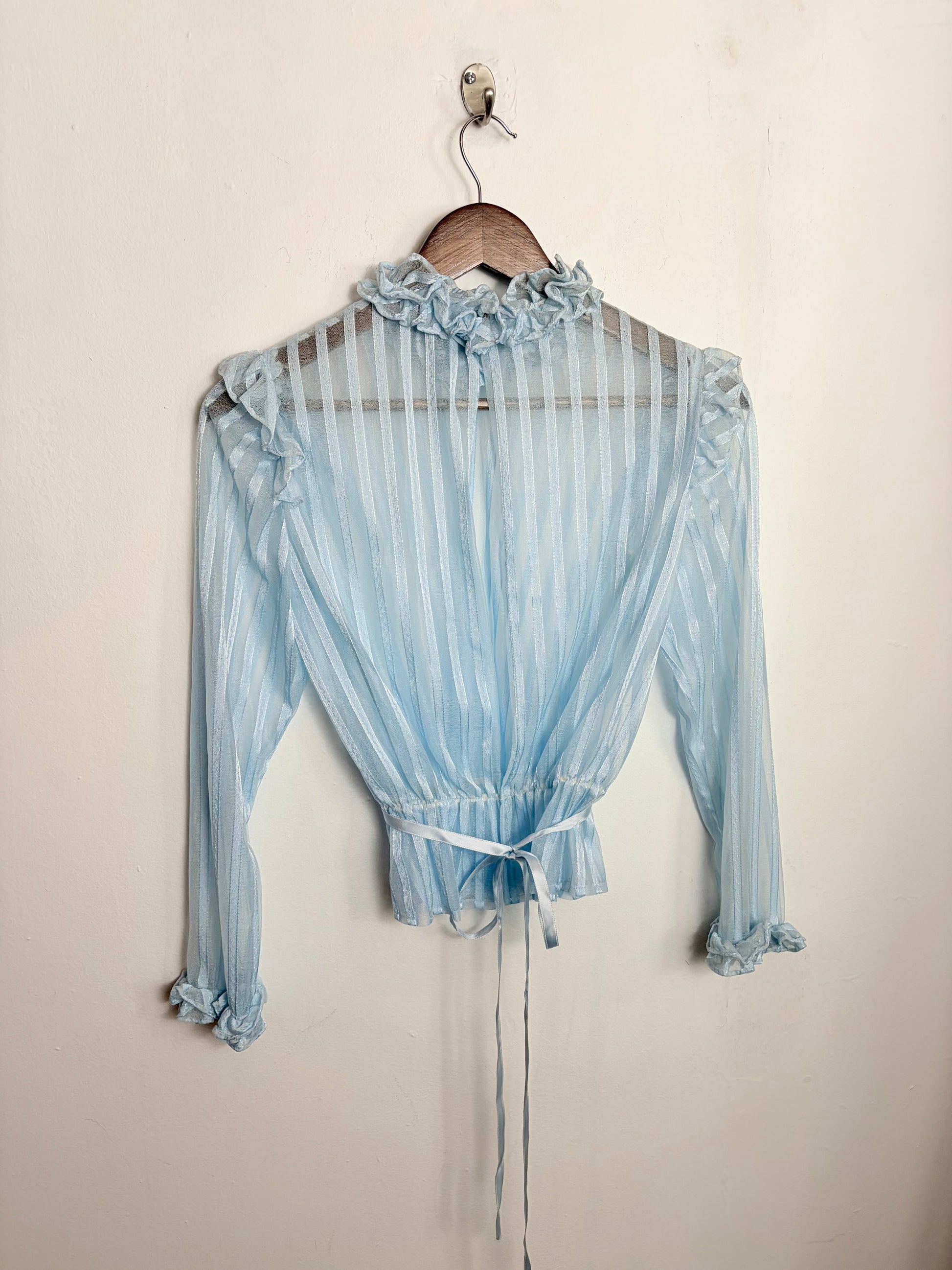 This vintage sheer powder-blue blouse has a structured mock-neck silhouette with a soft ruffled trim that gives it a distinct Victorian meets 80s feel. Vertical shimmering stripes run throughout the lightweight mesh, paired with gathered shoulders and ruffled cuffs for extra volume and texture. the back features an open slit and the waist cinches with a satin ribbon tie, creating an adjustable, gently billowed shape.