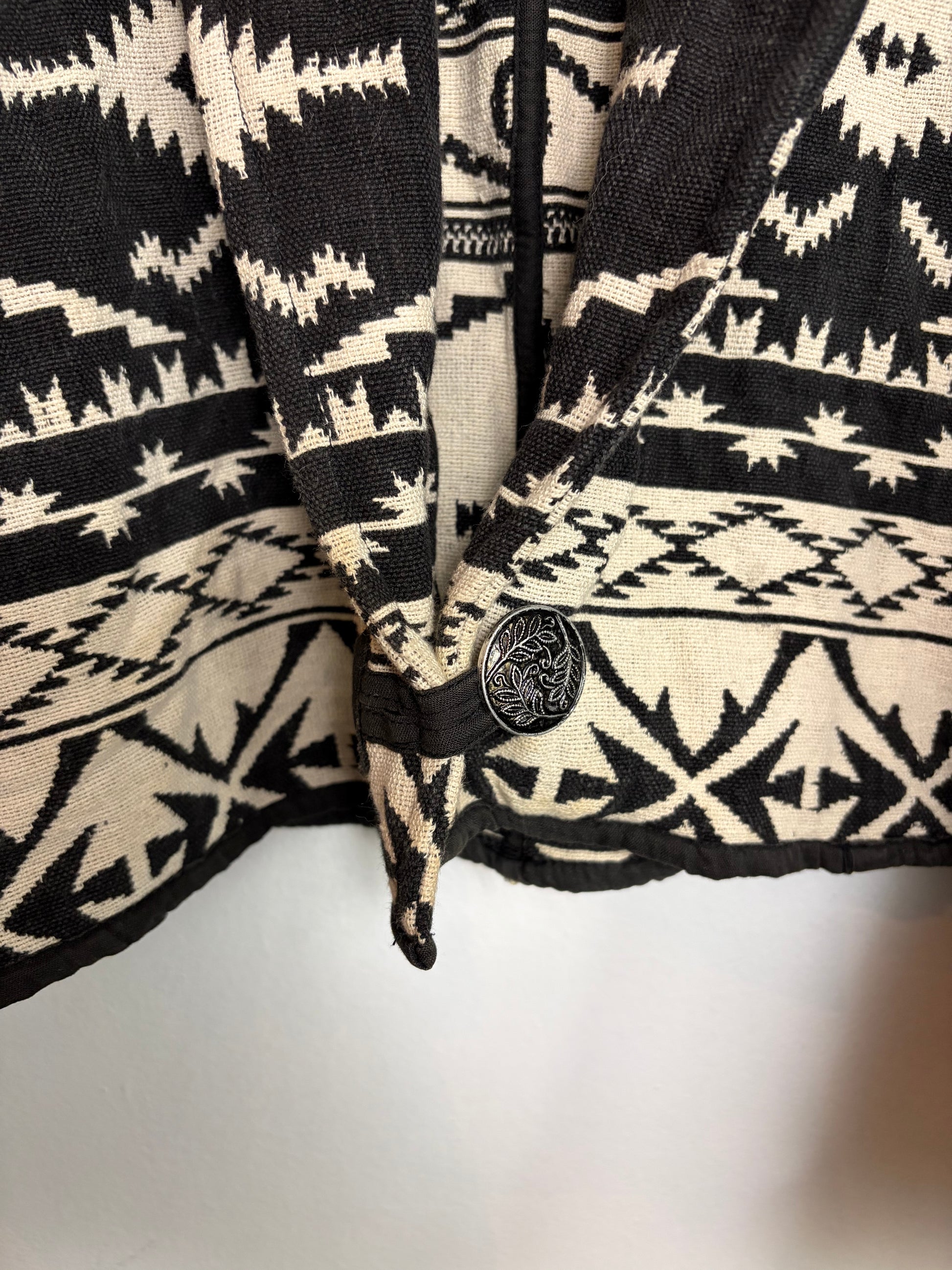 This vintage cropped jacket features a bold black and cream geometric pattern woven throughout, giving it a striking, tapestry-like texture. It's designed with a relaxed, open front and wide sleeves, finished with a decorative metal button and loop closure for added character. The structured collar and boxy silhouette make it an easy statement layer.