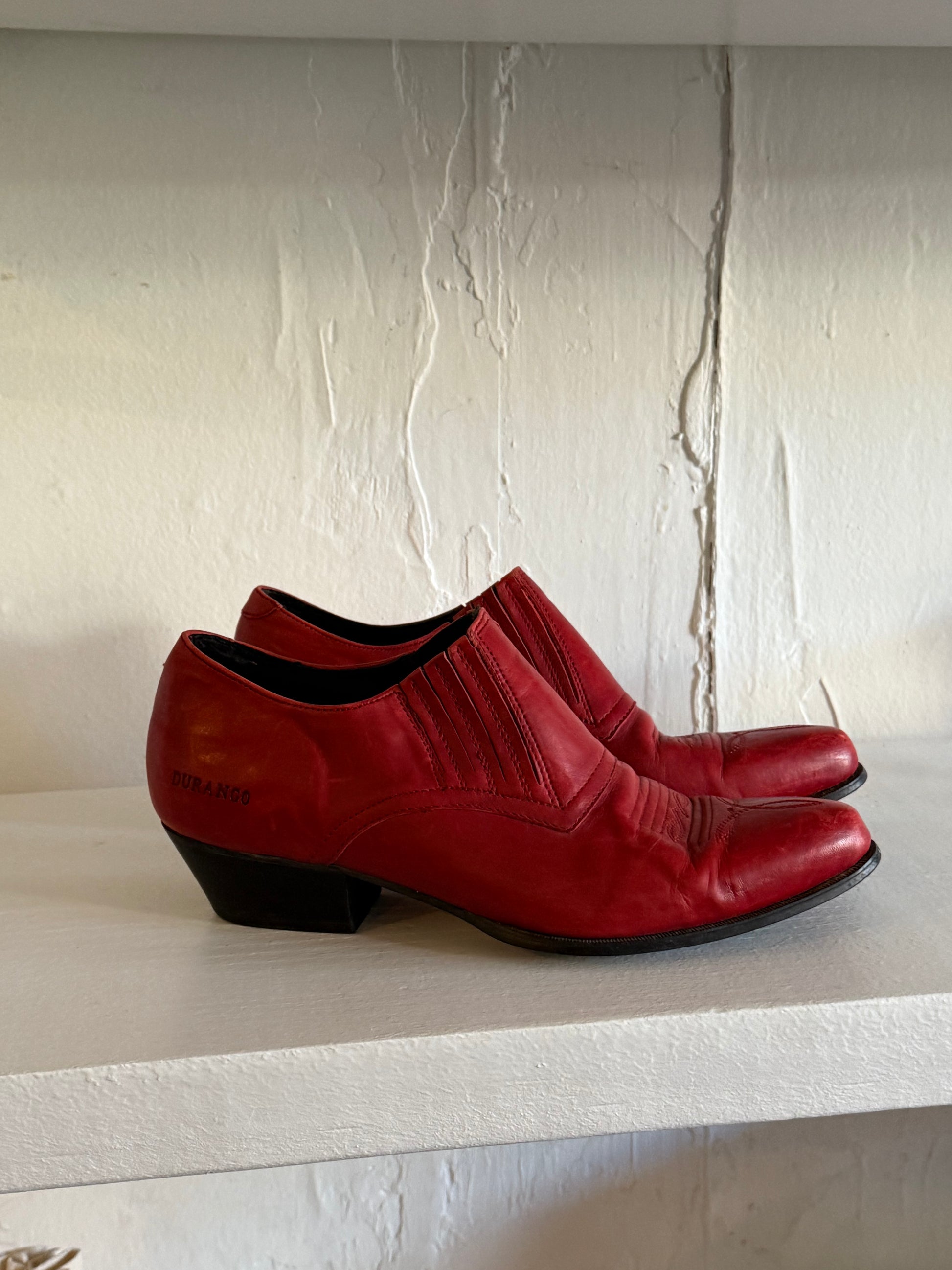Classic red leather western style booties with a block heel. The booties have elastic at the front sides for easy slipping on and off.