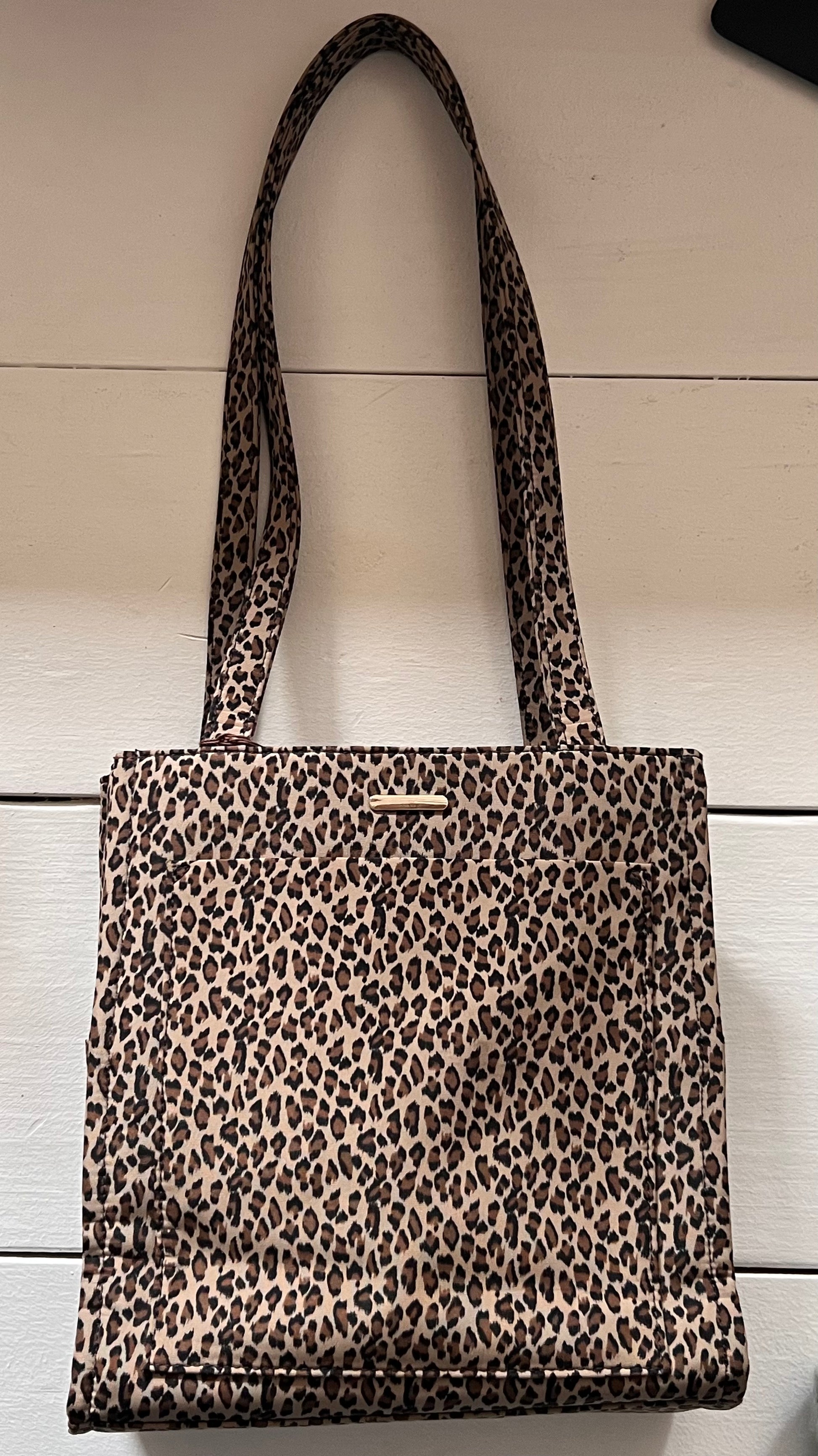 This structured cheetah-print bag combines style and functionality with a sophisticated silhouette. It features three compartments — two open and one central zippered interior pocket — complemented by a magnetic button closure for secure access. Additional front and back pockets, along with a small detachable compartment, provide versatile storage for everyday essentials, making this bag both practical and fashion-forward.