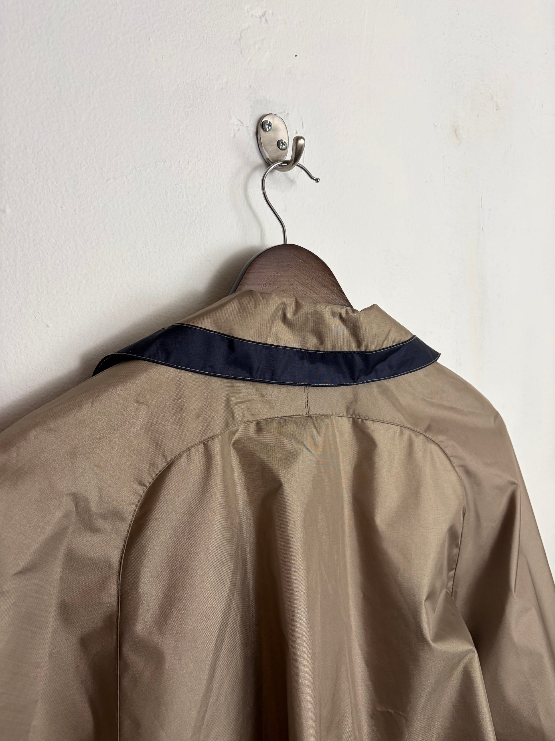 Lightweight vintage trench in a taupe-silver tone with navy contrast details and gold crest buttons. Features a double-breasted front, decorative sleeve tabs, and a back storm flap. Fully lined with an optional tie belt for shaping and front pockets. Easy, classic, and perfect for layering in rainy or windy weather.
