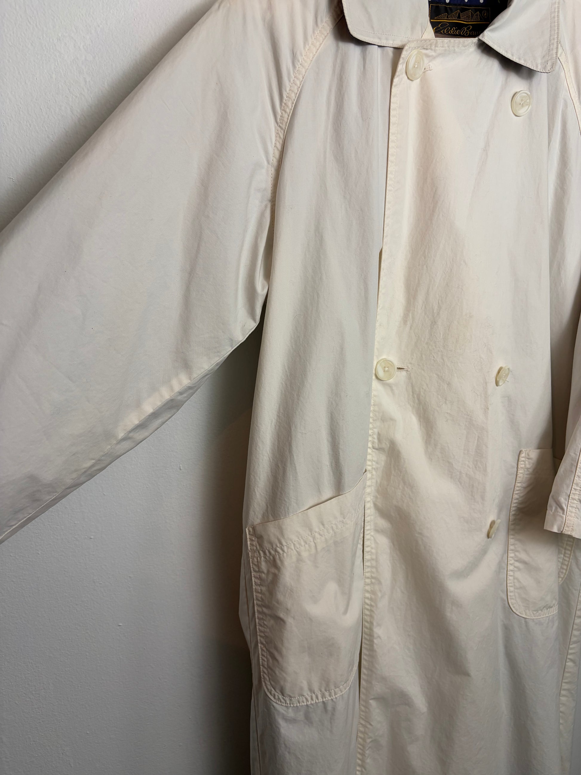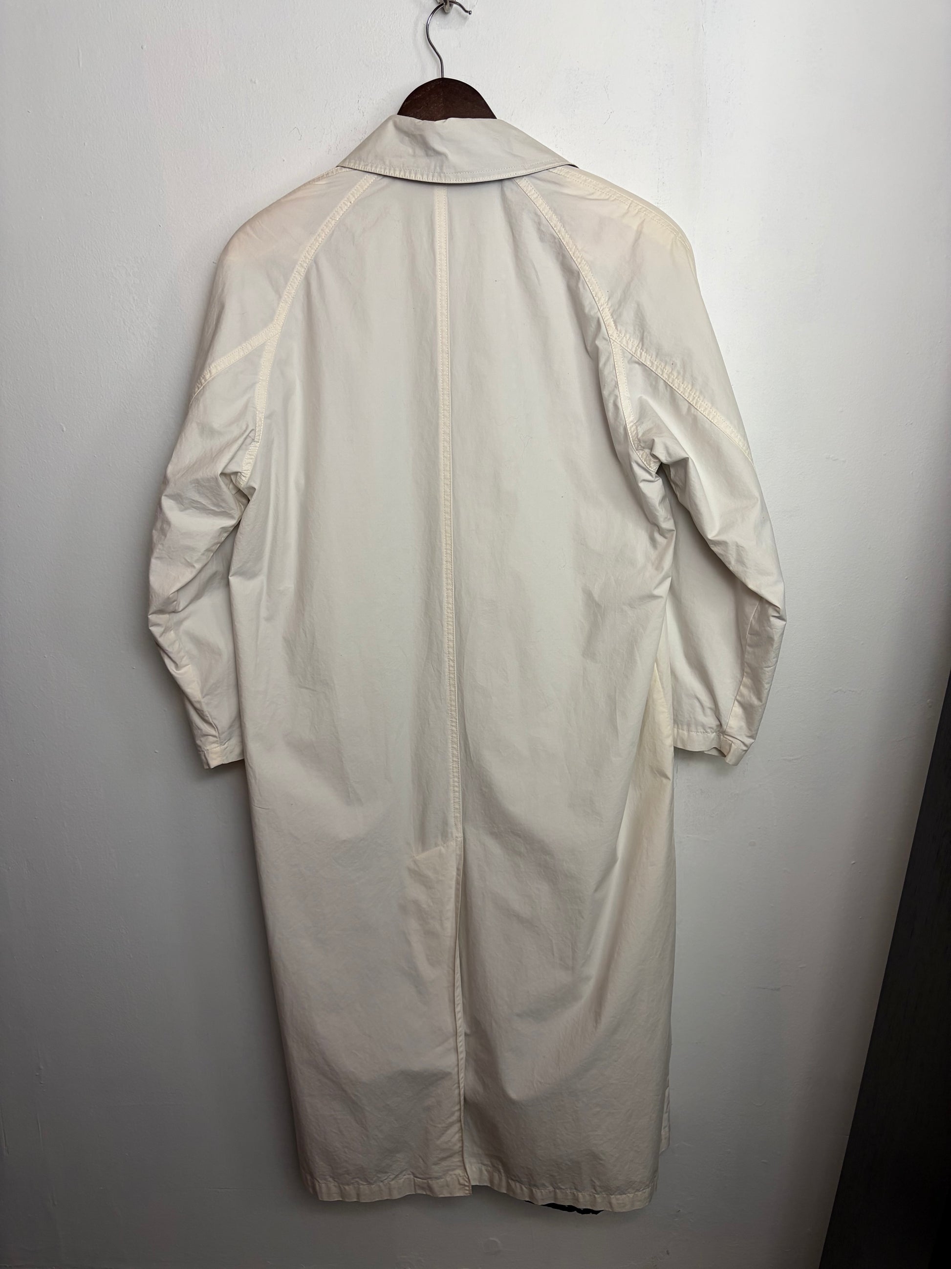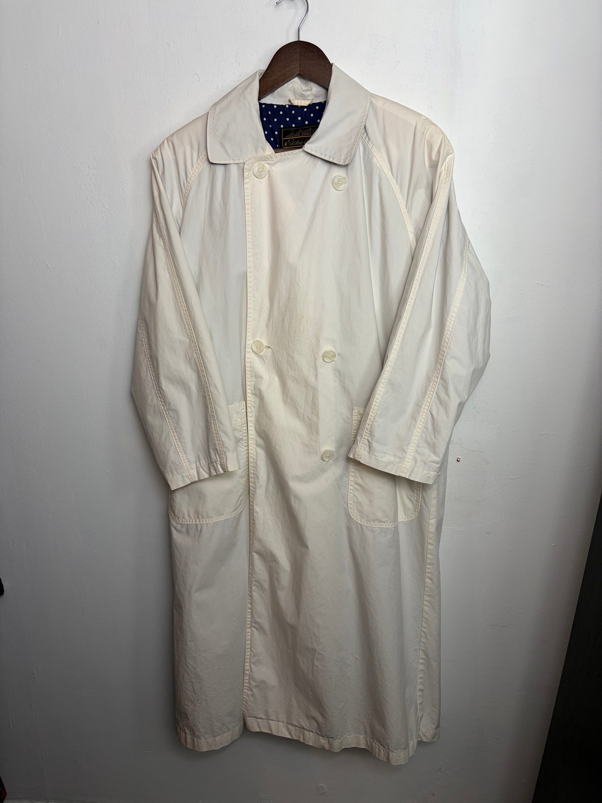 Classic white trench coat with a relaxed, slightly oversized silhouette and a timeless double-breasted front. Features wide-notched lapels, raglan sleeves, and roomy patch pockets for a utilitarian touch. The interior is fully lined in a navy-blue polka-dot fabric that adds a fun, unexpected contrast. Falls long on the body for an effortless, lightweight drape- perfect for transitional weather.