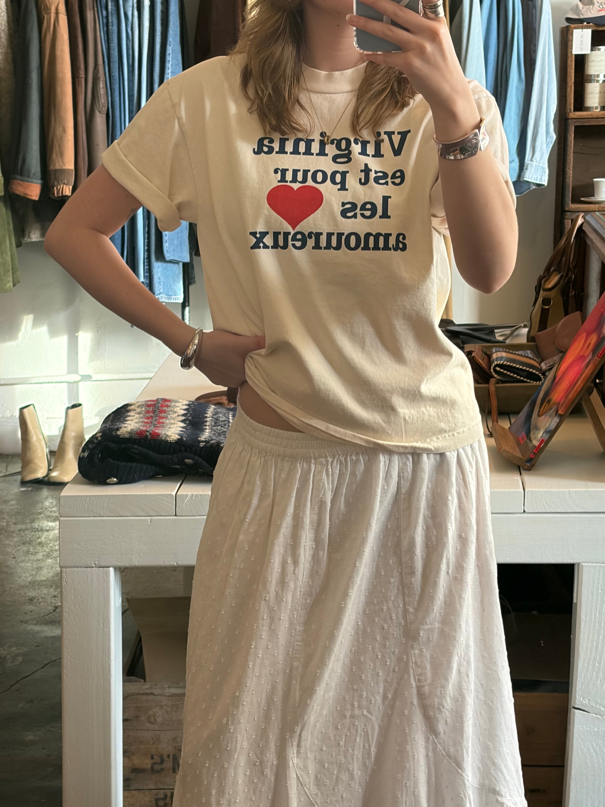 Favorite cream toned short sleeve wide garment dye tee with a front graphic reading "Virgina est pour les amoreaux" in a navy with a red heart. The t-shirt is full length with a boxier fit and has a short sleeve with a round neckline. Made from a heavy weight shrink-free cotton.